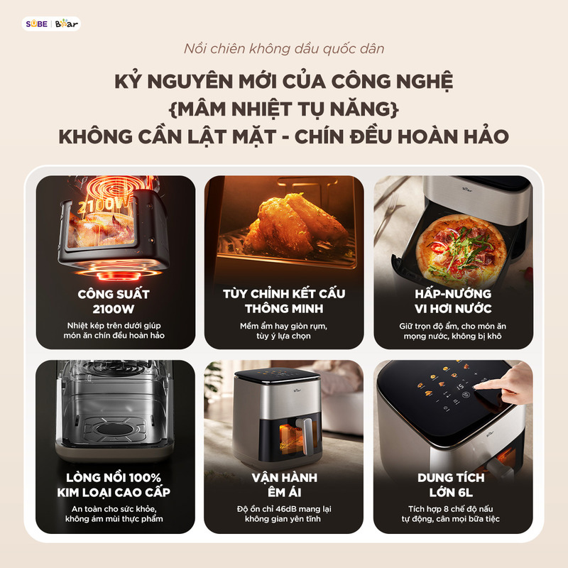 • Luồng khí nóng tốc độ cao: Không khí nóng được lưu thông tuần hoàn và mạnh mẽ khắp khoang nồi.